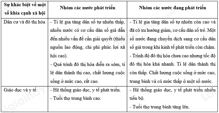 Sự khác biệt về một số khía cạnh xã hội giữa các nước phát triển và các nước đang phát triển: