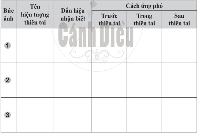 Hãy kể lại một câu chuyện mà em biết liên quan đến hậu quả của biến đổi khí hậu. Quan sát các bức ảnh trong SGK trang 46 và hoàn thành bảng sau. Chia sẻ cảm xúc của em khi được nghe kể (hoặc khi xem những đoạn phim, hình ảnh) về cuộc sống khó khăn của người dân ở vùng bị thiên tai. Sáng tạo một trang phục hoặc sản phẩm tái chế từ các đồ dùng đã qua sử dụng trong sinh hoạt hằng ngày. Viết bài giới thiệu về sản phẩm tái chế đó và nói lên thông điệp em muốn gửi đến mọi người. Hãy liệt kê những hành