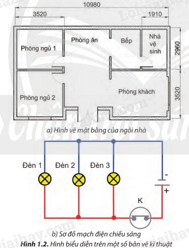 – Hình 1.2b trình bày sơ đồ mạch điện chiếu sáng có 3 bóng đèn, khóa điện, nguồn điện.