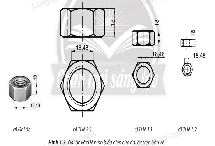 Quan sát phần tỉ lệ trên hình 1.3 để xác định các kích thước trên hình biểu diễn so với các kích thước tương ứng.