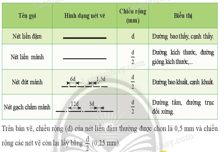 Nét vẽ được chọn làm cơ sở để xác định chiều rộng các loại nét vẽ còn lại trên bản vẽ là nét liền đậm. Cụ thể, các nét vẽ còn lại có chiều rộng bằng \(\frac{1}{2}\) nét liền đậm.