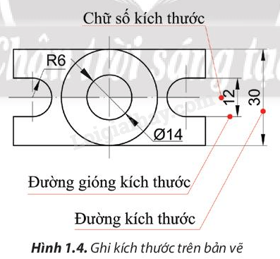Quan xác hình 1.4 để xác định mỗi liên hệ giữa đường gióng kích thước và đường kích thước.