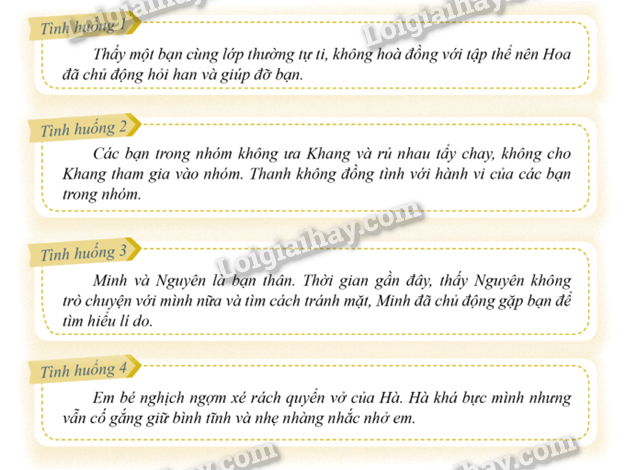 * Tình huống 1: Hoa chủ động hỏi han và giúp đỡ bạn khi bạn tự ti và không hào đồng với tập thể.