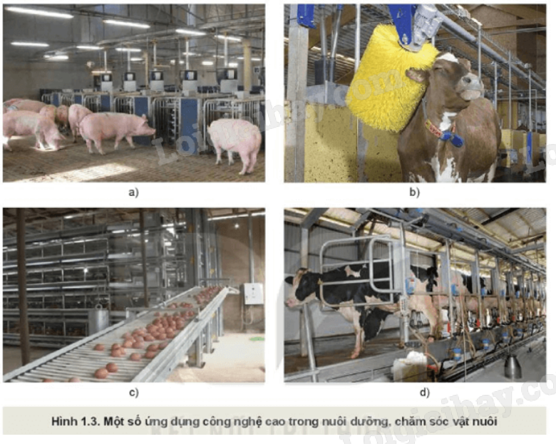 Quan sát Hình 1.3 và nêu tên các công nghệ áp dụng trong nuôi dưỡng, chăm sóc vật nuôi tương ứng với từng ảnh trong hình theo các gợi ý sau: công nghệ cho ăn thông minh, công nghệ vắt sữa bò tự động, công nghệ tắm chải tự động cho bò, công nghệ thu gom trứng gà tự động.