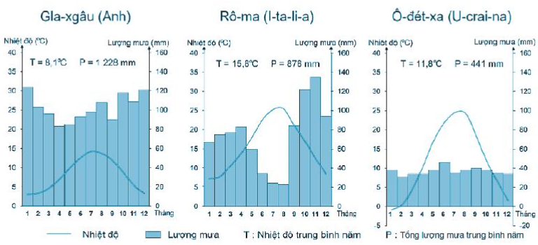 – Em hãy quan sát kĩ 3 biểu đồ nhiệt độ và lượng mưa ở ba địa điểm: Gla-xgâu (Anh), Rô-ma (I-ta-li-a), Ô-đét-xa (U-crai-na) để trả lời các yêu cầu của bài.
