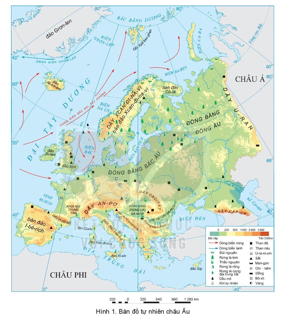 Đọc nội dung mục 2. Đặc điểm tự nhiên ở SGK – Tr.97 về phần địa hình “Châu Âu có hai khu vực địa hình: đồng bằng và miền núi. Khu vực đồng bằng chiếm 2/3 diện tích châu lục”. Đồng thời kết hợp quan sát hình 1. Bản đồ tự nhiên châu Âu, dựa theo phân tầng độ cao địa hình xác định được độ cao 0 – 200m chiếm phần lớn diện tích của châu Âu