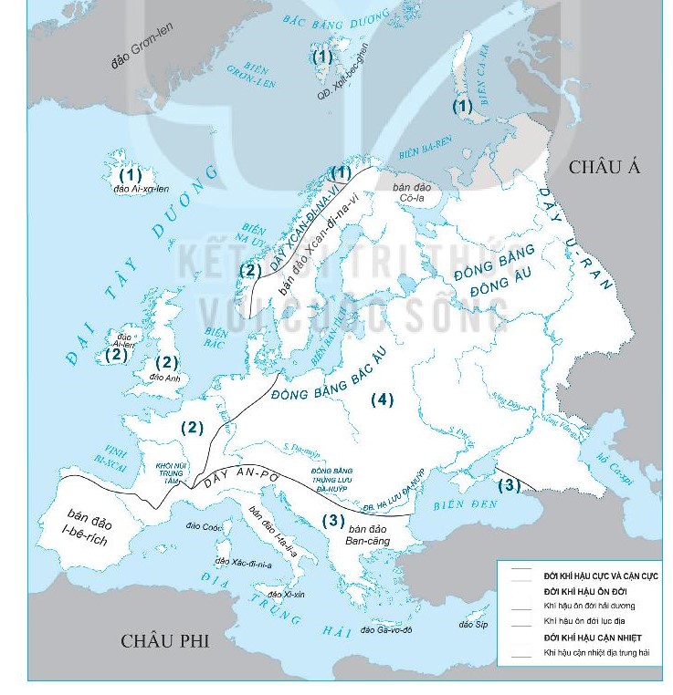 Điền chú giải cho lược đồ các đới và kiểu khí hậu ở châu Âu dưới đây.
