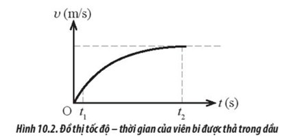Một vật chuyển động trong không khí, trong nước hoặc trong chất lỏng nói chung đều sẽ chịu tác dụng của lực cản. Xét một viên bi thép có khối lượng 1 g đang ở trạng thái nghỉ được thả rơi trong dầu. Người ta khảo sát chuyển động của viên bi trong dầu và vẽ đồ thị tốc độ theo thời gian của viên bi như Hình 10.2. Cho biết lực đẩy Archimedes có độ lớn là \({F_A} = 1,{2.10^{ – 3}}N\) và lấy g = 9,8 m/s2. Độ lớn lực cản của dầu tác dụng lên viên bi sau thời điểm t2 là