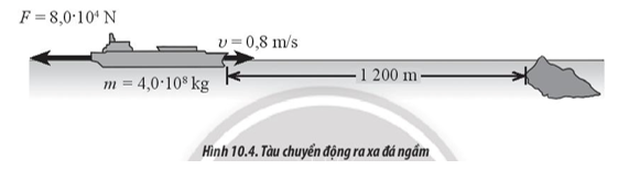 Một tàu chở hàng có tổng khối lượng là 4,0.108 kg đang vận chuyển hàng hóa đến nơi tiếp nhận thì đột nhiên động cơ tàu bị hỏng, lúc này gió thổi tàu chuyển động thẳng về phía đá ngầm với tốc độ không đổi 0,8 m/s. Khi tàu chỉ còn cách bãi đá ngầm một khoảng 1200 m thì gió ngưng thổi, đồng thời động cơ cũng được sửa chữa xong và hoạt động lại. Tuy nhiên bảnh lái của tàu bị kẹt và vì vậy, tàu chỉ có thể tăng tốc lùi thẳng ra xa khỏi bãi đá ngầm (Hình 10.4). Biết lực do động cơ sinh ra có độ lớn 8,0.104 N và lực cản xem như không đáng kể.