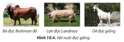 Quan sát hình 10.4 ta thấy hình ảnh 3 loại vật nuôi đực giống là bò đực Brahmand đỏ, lợn đực Landrace và dê đực giống.