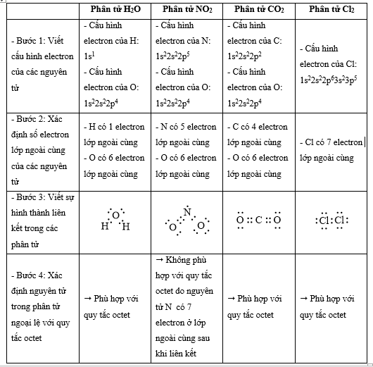 Theo nguyên tắc octet, khi hình thành liên kết hóa học, các nguyên tử có xu hướng nhường, nhận hoặc góp chung electron để đạt tới cấu hình electron bền vững giống như