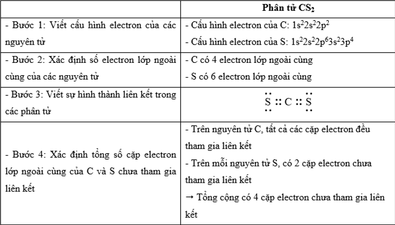 + Bước 4: Xác định tổng số cặp electron lớp ngoài cùng của C và S chưa tham gia liên kết