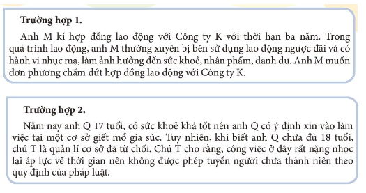 Trường hợp. Chị H kí hợp đồng làm công nhân khai thác đá ở một tỉnh miền núi, dù biết đây là công việc nặng nhọc với phụ nữ. Khi đến công trường khai thác đá, nhận thấy công việc không đúng như khi giao kết hợp đồng, địa điểm làm việc không đảm bảo điều kiện làm việc, thậm chí còn có thể nguy hiểm đến tính mạng và sức khoẻ nên chị H đã từ chối làm việc. Chủ doanh nghiệp khai thác đá nói chị đã tự nguyện kí hợp đồng do vậy, chị phải làm, không được từ chối công việc.