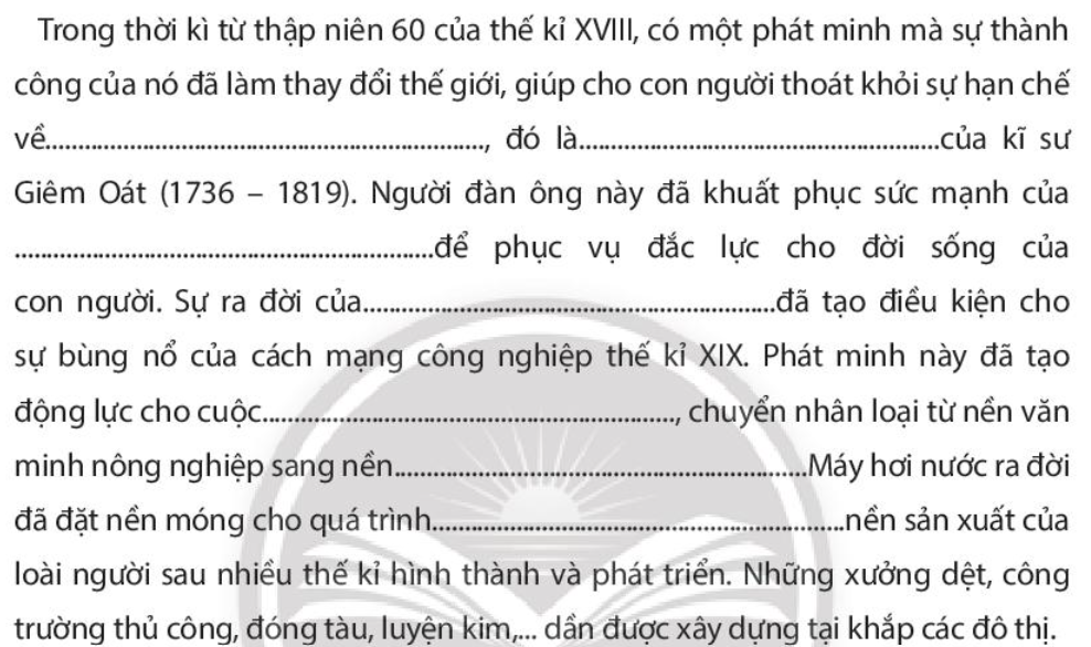Câu 4. Chọn các từ hoặc cụm từ dưới đây, điền vào chỗ trống (…) để giải thích vì sao máy hơi nước ra đời đã mở ra kỉ nguyên sản xuất cơ khí, cơ giới hóa.
