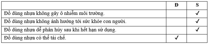 Em hãy tích chọn đúng (Đ) hoặc (S) phù hợp đối với các nhận xét về đồ dùng bằng nhựa.