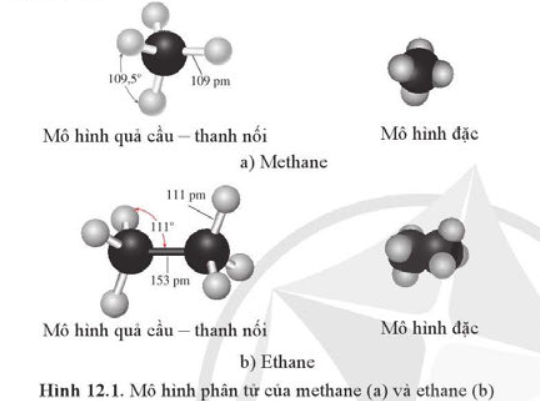 – Trong phân tử ethane, mỗi nguyên tử C nằm ở tâm của một tứ diện mà bốn đỉnh là các nguyên tử hydrogen và carbon, các góc liên kết khoảng 109,5o.