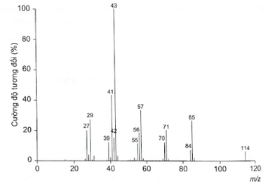 Khối lượng mol phân tử của (X) được xác định trên phổ khối lượng tương ứng với peak có giá trị m/z lớn nhất. Do đó, từ phổ khối lượng của (X), ta có: \[{{\rm{M}}_{\left( X \right)}} = 114\]