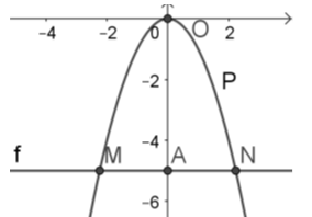 Đường thẳng song song với \(Ox\) cắt \(Oy\) tại \(-5\)  là đường thẳng \(f:y=-5\). Hoành độ giao điểm của \(\left( P \right)\) và \(f\) là nghiệm của phương trình \(-{{x}^{2}}=-5\Rightarrow \left[ \begin{align}& x=\sqrt{5} \\& x=-\sqrt{5} \\\end{align} \right.\). Vậy \(M(-\sqrt{5};-5);N(\sqrt{5};-5)\).