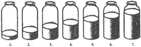 Đổ những lượng nước khác nhau vào bảy cái chai như hình vẽ. Thổi mạnh vào miệng các chai. Cho biết vật nào dao động phát ra âm:
