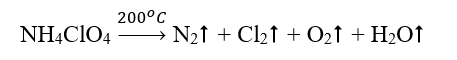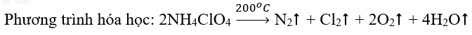 Sơ đồ phản ứng: \(\mathop N\limits^{ – 3} {H_4}\mathop {Cl}\limits^{ + 7} {\mathop O\limits^{ – 2} _4}\xrightarrow{{{{200}^o}C}}{\mathop N\limits^0 _2} \uparrow + {\mathop {Cl}\limits^0 _2} \uparrow + {\mathop O\limits^0 _2} \uparrow + {H_2}O\)