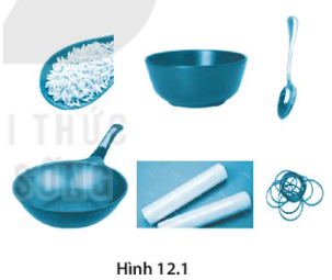 Với các dụng cụ thí nghiệm gồm: một ít gạo; một cái bát sứ; một thìa inox; một cái chảo bằng kim loại; một màng nylong bọc thức ăn; vài dây cao su (H 12.1). Hãy thiết kế phương án thí nghiệm chứng tỏ rằng khi dùng thìa inox gõ vào đáy chảo phát ra âm thanh dưới dạng sóng âm có thể truyền qua không khí tới màng nylong căng trên miệng bát sứ.