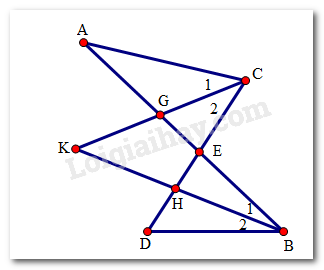 Xét tam giác KHC và tam giác DHB và theo tính chất góc ngoài của tam giác ta có:\(\left\{ \begin{array}{l}\widehat K + \widehat {{C_2}} = \widehat {EHB}\\\widehat D + \widehat {{B_2}} = \widehat {EHB}\end{array} \right. \Rightarrow \widehat K + \widehat {{C_2}} = \widehat D + \widehat {{B_2}}\) (2)