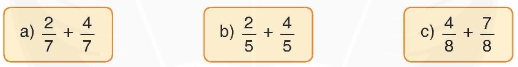$\frac{4}{7} + \frac{2}{7}$ ; $\frac{4}{5} + \frac{2}{5}$ và $\frac{7}{8} + \frac{4}{8}$