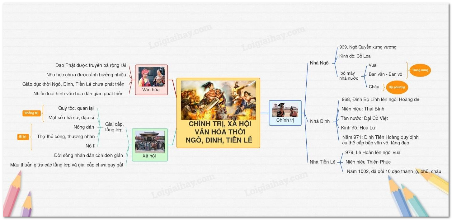 1. Vẽ sơ đồ tư duy về tình hình chính trị, xã hội và văn hóa thời Ngô, Đinh, Tiền Lê.