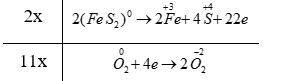 + Quá trình oxi hóa: \(2{{(\overset{{}}{\mathop{Fe}}\,{{S}_{2}})}^{0}}\to \overset{+3}{\mathop{2Fe}}\,+4\overset{+4}{\mathop{S}}\,+22e\)