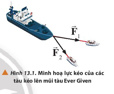 Ngày 23/03/2021, siêu tàu Ever Given bị mắc cạn khi di chuyển qua kênh đào Suez. Sự cố đã làm tê liệt tuyến giao thông huyết mạch này theo cả hai hướng. Ngày 29/03/2021, con tàu đã được giải cứu thành công nhờ các tàu kéo hạng nặng (Hình 13.1). Tại sao các tàu kéo chuyển động lệch phương với nhau nhưng vẫn kéo được tàu Ever Given khỏi điểm mắc cạn?