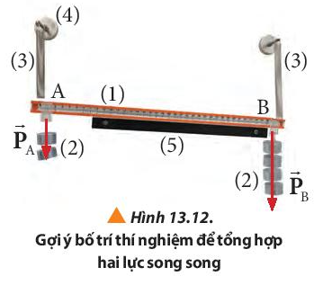 6. Đề xuất phương án xác định lực tổng hợp của hai lực song song với dụng cụ và bố trí được gợi ý trong bài.