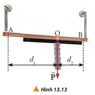 Bước 3: Treo các quả cân vào cùng một vị trí trên thước AB (số lượng các quả cân và vị trí có thể thay đổi) sao cho thước trở lại đúng vị trí đánh dấu lúc đầu. Đo các giá trị AO và BO trên thước