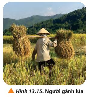 Một người đang gánh lúa như Hình 13.15. Hỏi vai người đặt ở vị trí nào trên đòn gánh để đòn gánh có thể nằm ngang cân bằng trong quá trình di chuyển? Biết khối lượng hai bó lúa lần lượt là m= 7 kg, m= 5 kg và chiều dài đòn gánh là 1,5 m. Xem như điểm treo hai bó lúa hai đòn gánh và bỏ qua khối lượng đòn gánh.