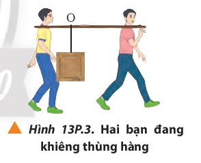 3. Hai người đang khiêng một thùng hàng khối lượng 30 kg bằng một đòn tre dài 2 m như Hình 13P.3. Hỏi phải treo thùng hàng ở điểm nào để lực đè lên vai người đi sau lớn hơn lực đè lên vai người đi trước 100 N. Bỏ qua khối lượng của đòn tre.