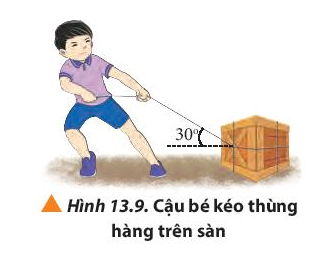 Một cậu bé đang kéo thùng hàng trên mặt đất bằng sợi dây hợp với phương ngang một góc 30(Hình 13.9). hãy tìm độ lớn lực kéo thành phần trên hai phương vuông góc và song song với mặt đất, biết độ lớn lực kéo cậu bé tác dụng lên dây là 12 N.