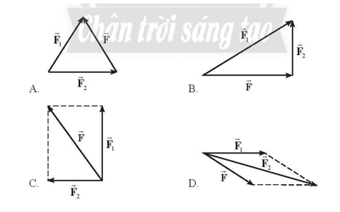 Hình vẽ nào sau đây biểu diễn đúng lực tổng hợp của hai lực \(\overrightarrow {{F_1}} \), \(\overrightarrow {{F_2}} \)?