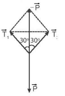 \(\overrightarrow {{T_1}}  + \overrightarrow {{T_2}}  + \overrightarrow P  = \overrightarrow 0 \) => \(\overrightarrow {{T_1}}  + \overrightarrow {{T_2}}  =  – \overrightarrow P \)