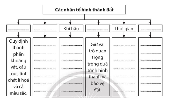 Dựa vào nội dung mục II, bài 14 trong SGK, em hãy hoàn thành sơ đồ thể hiện các nhân tố hình thành đất sau đây
