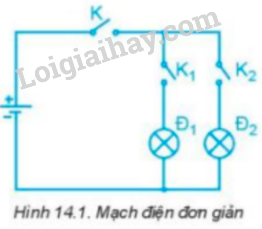 Kể tên các thành phần cơ bản có trong mạch điện đơn giản ở Hình 14.1. Khi nào đèn Đ1, Đ2 cùng sáng?
