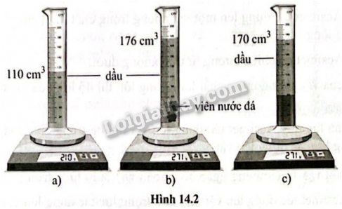Một bạn muốn biết viên nước đá nổi hay chìm trong dầu (dầu có khối lượng riêng 0,800 g/ml) nên đã tiến hành thí nghiệm bằng cách thả viên nước đá vào trong 110 cm3 dầu và thu được kết quả như hình 14.2.