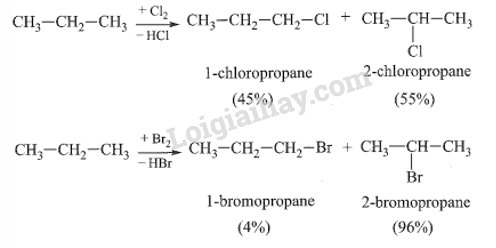 Monochlorine hoá propane (có chiếu sáng, ở 25oC), thu được 45% 1-chloropropane và 55% 2-chloropropane; còn monobromine hoá propane (có chiếu sáng và đun nóng đến 127oC), thu được 4% 1-bromopropane và 96% 2-bromopropane. Dựa trên các kết quả thực nghiệm này, hãy nhận xét về:
