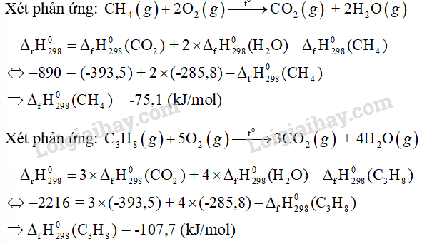 Tính nhiệt hình thành chuẩn của methane và propane. Biết nhiệt cháy chuẩn của methane và propane lần lượt bằng -890 kJ/mol và -2216 kJ/mol; nhiệt hình thành chuẩn của CO2(g) và H2O(l) lần lượt là -393,5 kJ/mol và -285,8 kJ/mol.