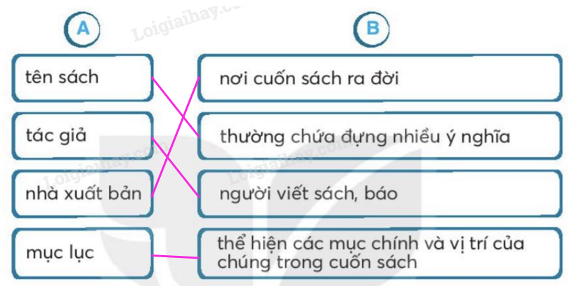 Nối từ ngữ ở cột A với nội dung thích hợp ở cột B. Xếp các từ ngữ trong ngoặc đơn vào nhóm thích hợp. Viết tiếp để hoàn thành câu. Đọc mục lục ở tranh bên và điền thông tin vào chỗ trống. Dựa vào bìa sách sau, điền thông tin vào chỗ trống.