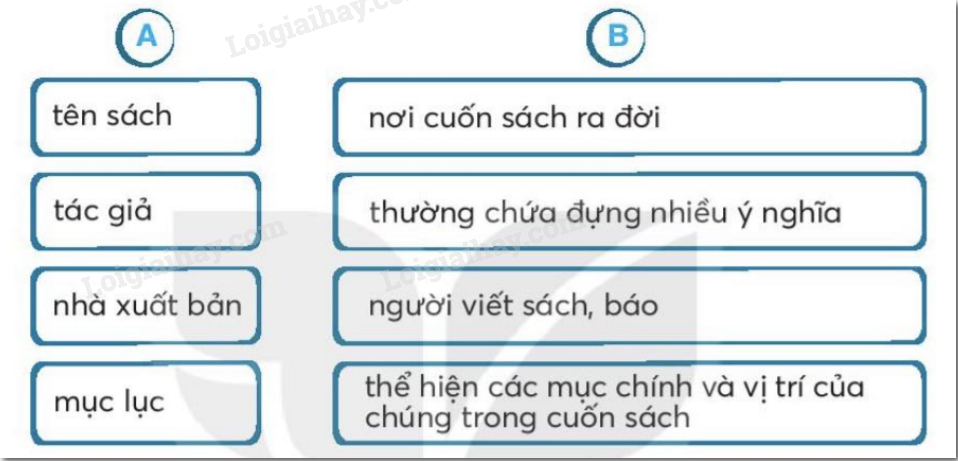 Nối từ ngữ ở cột A với nội dung thích hợp ở cột B. Xếp các từ ngữ trong ngoặc đơn vào nhóm thích hợp. Viết tiếp để hoàn thành câu. Đọc mục lục ở tranh bên và điền thông tin vào chỗ trống. Dựa vào bìa sách sau, điền thông tin vào chỗ trống.