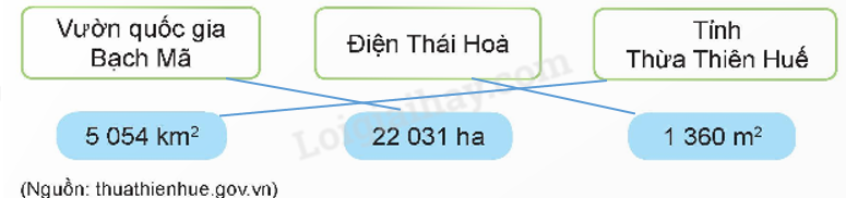 Nối mỗi địa danh với số đo diện tích phù hợp.