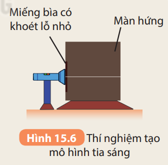 – Dùng miếng bìa có khoét một lỗ nhỏ hoặc che tấm kính của đèn pin và bố trí  thí nghiệm như Hình 15.6. Bật đèn pin, điều chỉnh miếng bìa sao cho vệt sáng từ lỗ nhỏ đi là là trên mặt màn hứng.