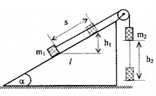 Ta có, khi \({m_1}\) đi lên quãng đường \(s = 1m\) trên mặt phẳng nghiêng thì \({m_2}\) đi xuống thẳng đứng một quãng đường cũng bằng \(s\)