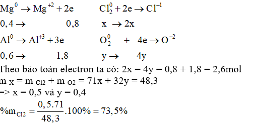 \(\begin{array}{l}M{g^0} \to M{g^{ + 2}} + 2e             {\rm{          Cl}}_2^0 + 2e \to C{l^{ – 1}}\\x \to {\rm{                 2x          0,1}} \to {\rm{0,2}}\\{\rm{A}}{{\rm{l}}^0} \to A{l^{ + 3}} + 3e{\rm{              O}}_2^0{\rm{    }} + {\rm{  }}4e \to {{\rm{O}}^{ – 2}}{\rm{ }}\\y \to {\rm{              3y              0,075}} \to 0,3\end{array}\)