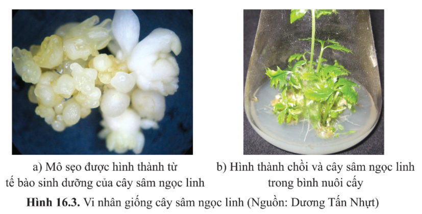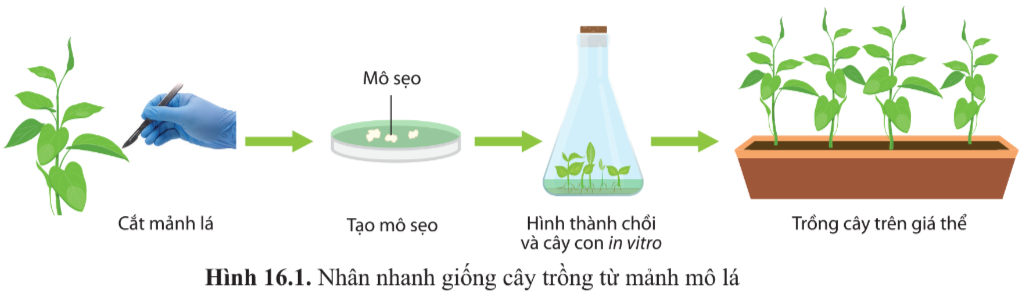 Người ta có thể nuôi mảnh mô lá, thân, rễ trong môi trường nhân tạo (hỉnh 16.1) để nhân giống nhanh tạo ra hàng loạt cây con. Việc nhân nhanh giống cây như trên có ý nghĩa như thế nào trong thực tiễn?
