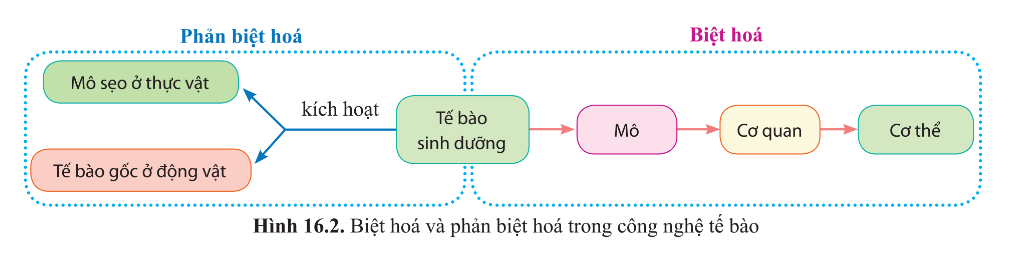 Quan sát hình 16.2, trình bày sự khác nhau giữa biệt hoá và phản biệt hoá tế bào.